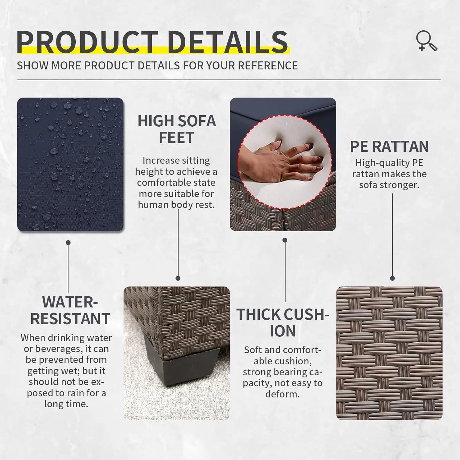 - UPGRADED COMFORT: There are anti-slip granules designed under the seat cushions so that the cushions won’t slip; the sofa feet are designed twice as high as our original set, more user-friendly; our high resilience thick padded cotton cushion, will provide you the optimal comfort and relaxation