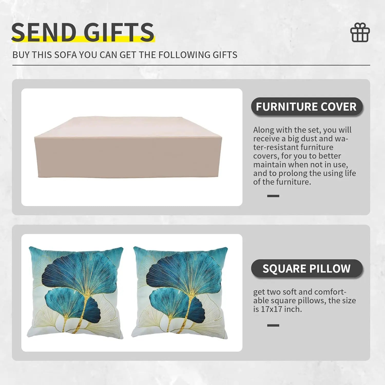 - GIFTS: A big furniture cover and two decorative pillows are sent as gifts to you