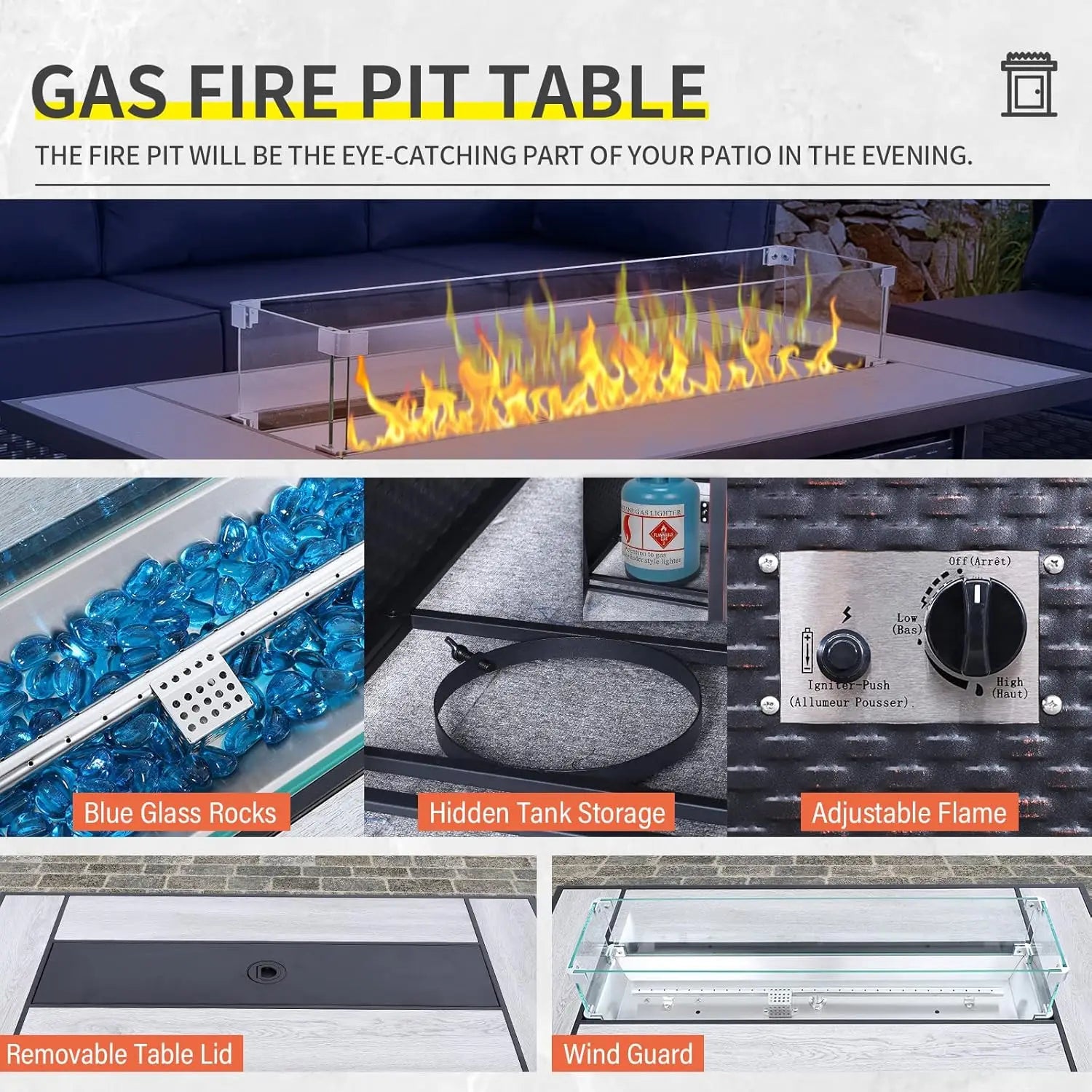 - 45” CSA APPROVED GAS FIRE PIT TABLE: An easy to use and safe propane fire pit table is included. It is 50,000 BTU heat output, and will provide you and your family more warmth in cool summer evening or winter days.