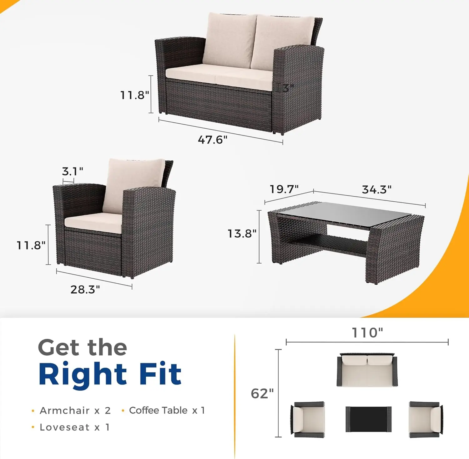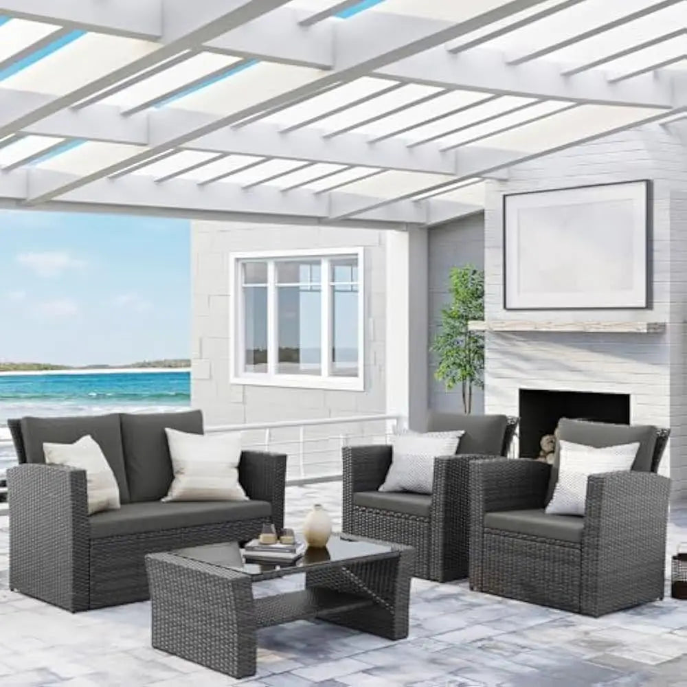 - EASY CARE&SHIPPING- The weather, rust-resistant 4 piece outdoor set is easy to clean, just hose it down with mild soap. Zipper-designed cushion cover is machine washable. (We suggest it's better to bring the cushions inside during the extreme weather.) Note: The patio furniture set includes 2 separate boxes in total and may deliver at different times.