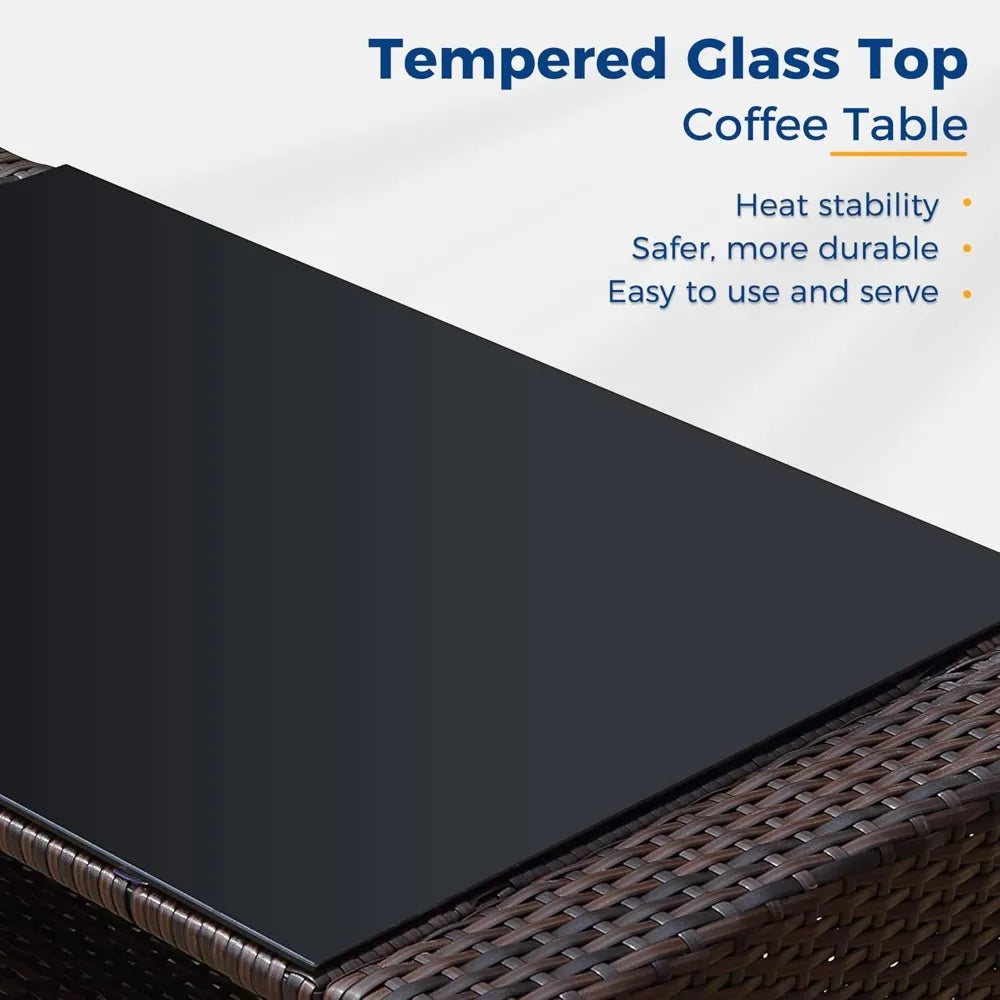 - ELEVATED LOOK- Handmade in textural modern wicker, our boho-inspired wicker outdoor set is relaxed, go-with-everything patio furniture. Compared to many other options, the generously proportioned seating of the set ensures sturdy construction and a large capacity. Plus, the tempered glass coffee table features a flared leg design and a bottom shelf for an extra storage room.
