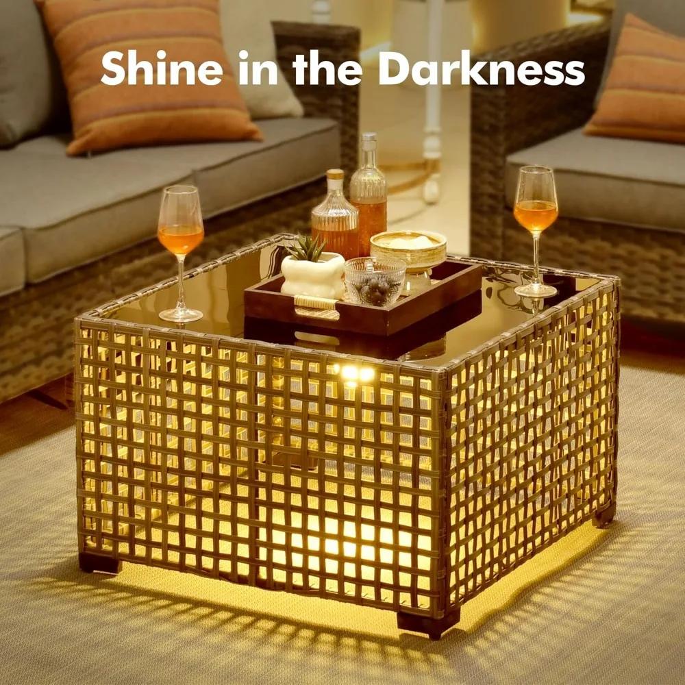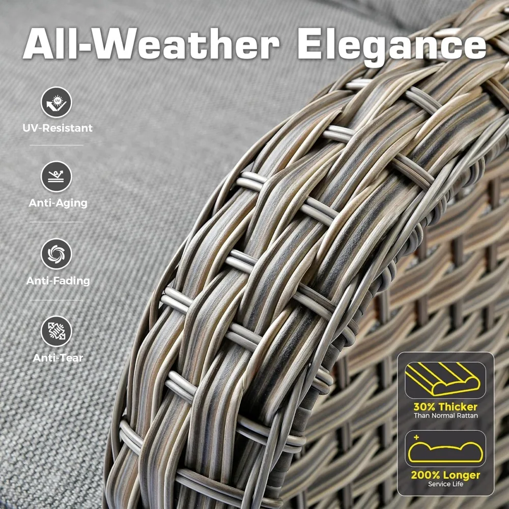 All-Weather Wicker Patio Sofa Set:Crafted with premium, handwoven PE rattan built to endure rain, snow, and blazing sun, this outdoor furniture set maintains its elegance year-round. Whether hosting guests or relaxing solo, your patio conversation set — including the outdoor sofa and chair set — resists stains, waterprrof, offering effortless maintenance for a pristine backyard oasis Cloud-Like Comfort, Built to Last:Sink into the comfy thick seat cushions and ergonomic backrests of our patio furniture set, designed for all-day lounging. Every piece — even the ottomans — supports up to 350 lbs, combining plush comfort with industrial-strength durability Weatherproof Fabrics, Zero Hassle:The wicker conversation set features quick-dry, stain-repellent cushion. High-density foam retains shape season after season, while breathable fabric ensures cool comfort. (Pro tip: Use a dust cover when stored to prolong your outdoor furniture set's lifespan.) Your Outdoor Sanctuary Awaits:Transform your deck,porch,balcony,sunroom,patio, poolside, or garden into a luxury retreat. The wicker sofa couch seating set’s curved design and supportive cushions invite endless relaxation — perfect for sunset chats or solo unwinding Effortless Assembly & Care:Enjoy hassle-free setup with included tools. Clean spills instantly with a damp cloth, or machine-wash removable cushion covers. The tempered glass tabletop wipes clean in seconds, making maintenance a breeze