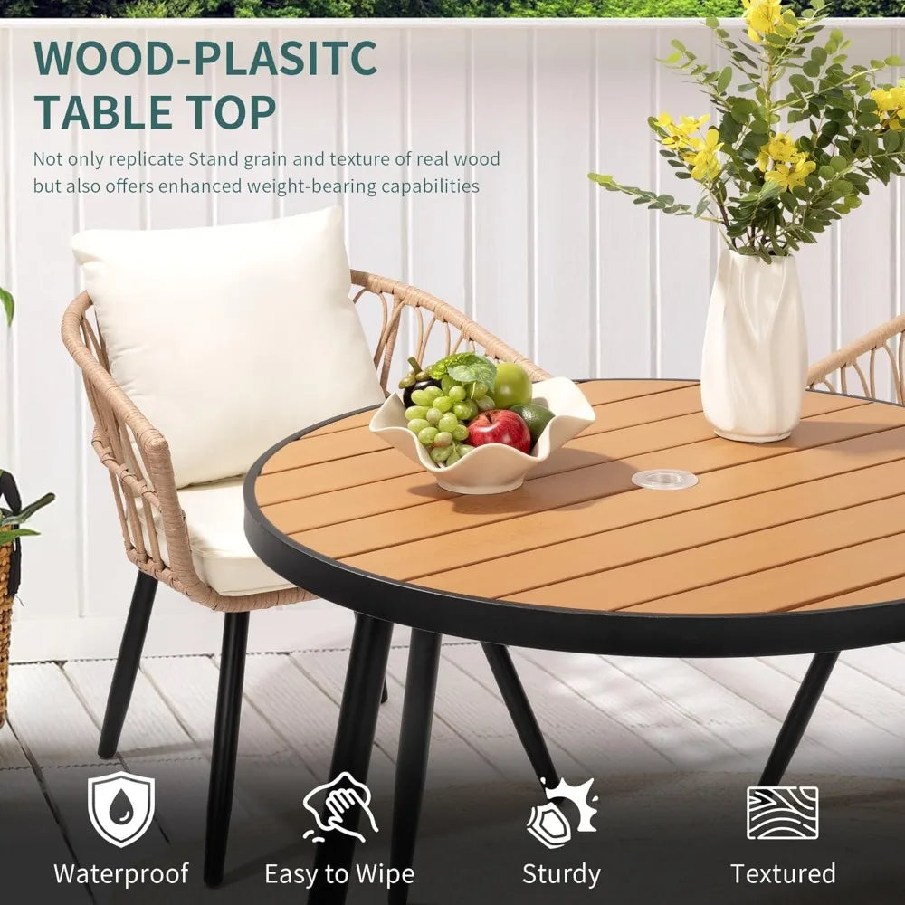 - 【Durable Plastic-Wood Tabletop】The round dining table features a wood-like plastic composite top, combining the aesthetic of natural wood with enhanced durability and easy maintenance. Resistant to stains and weather, it includes a 1.8-inch umbrella hole for shade and adjustable legs for stability on uneven surfaces.
