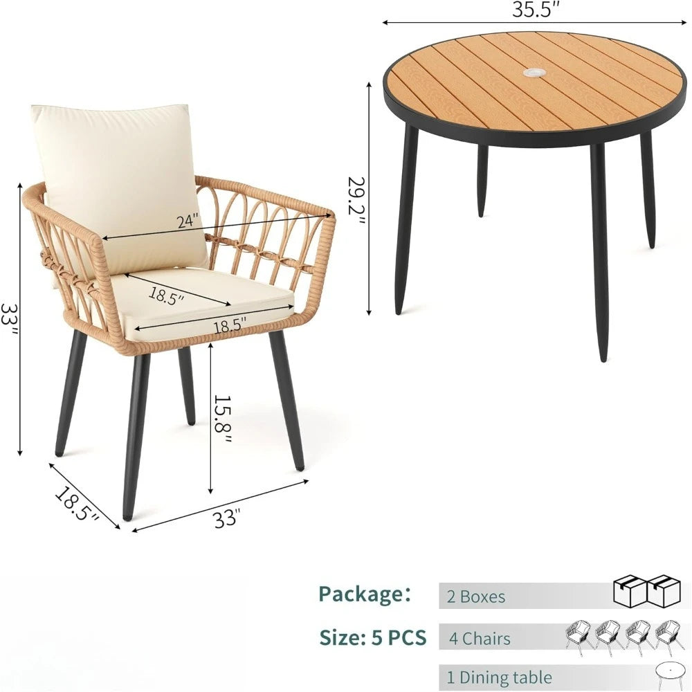 - 【Dimensions & Assembly 】Dimension of round dining table: 35.5"×29.2" (D x H).Dimension of chair: 33"×18.5"×18.5" . Packed with 4 x Wicker Armchair and 1 x Dining Table. The patio dining set arrives in 2 separate boxes (may ship at different times) with all hardware and instructions for quick assembly. Contact us immediately if transit damage occurs—we’re here to help!