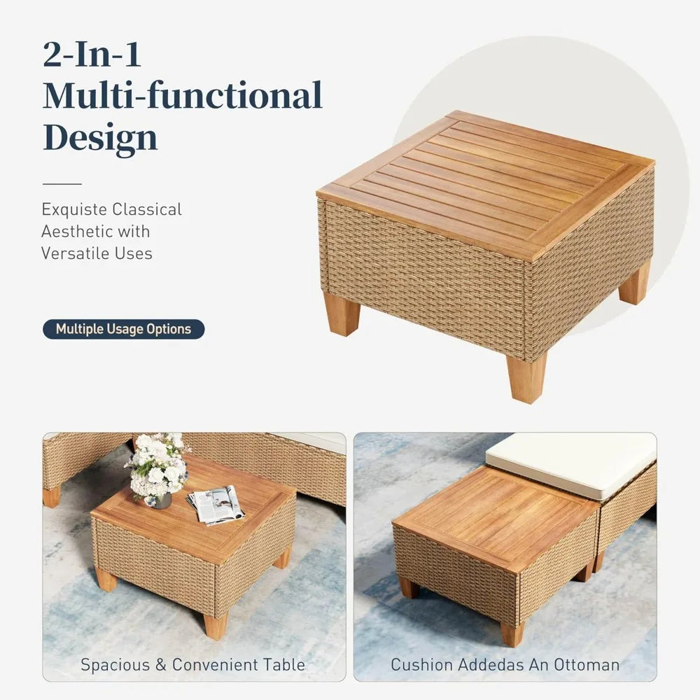 - ELEGANT COFFEE TABLE: Upgrade your outdoor experience with our stylish and durable outdoor coffee Table. Made of high-quality acacia wood and woven wicker, this table is weather-resistant, fade-proof, and easy to clean—perfect for withstanding sun, rain, and everyday use