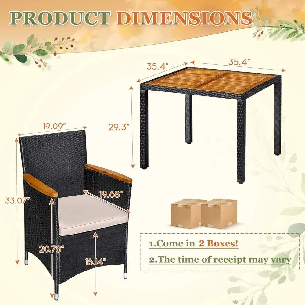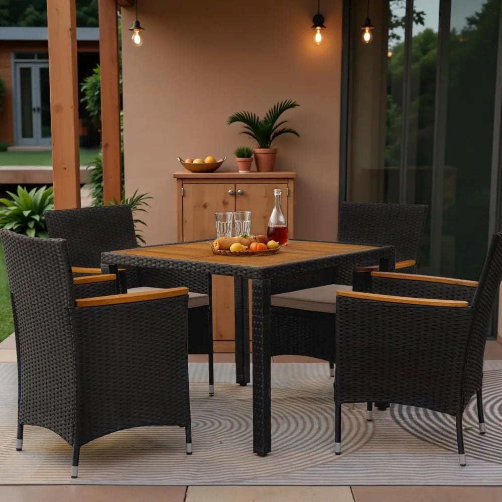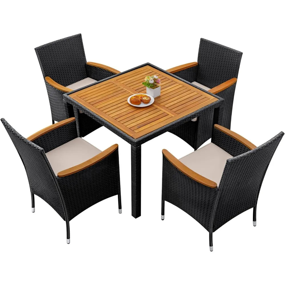 CORDOBA 5 Pieces Outdoor Patio Dining Set, Conversation Sets with 1 Table and 4 Rattan Chairs with Curved Acacia Wooden Armrests