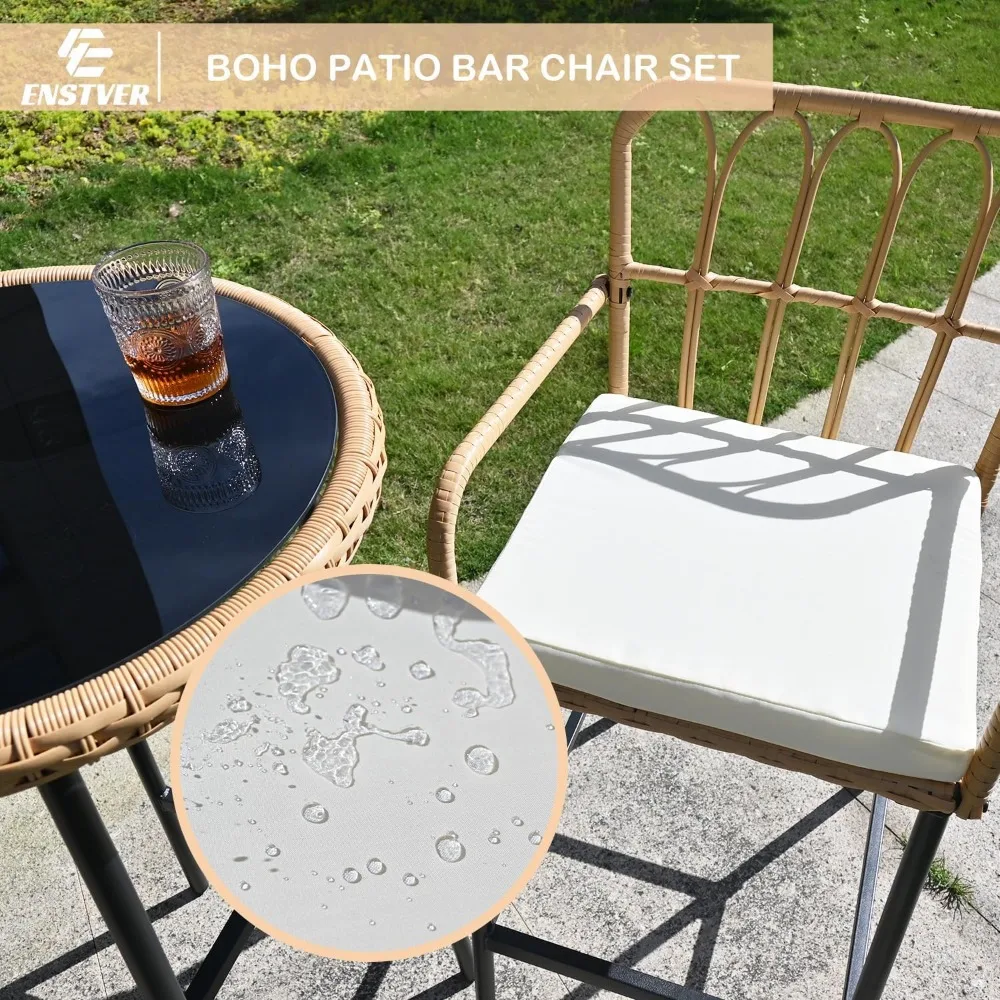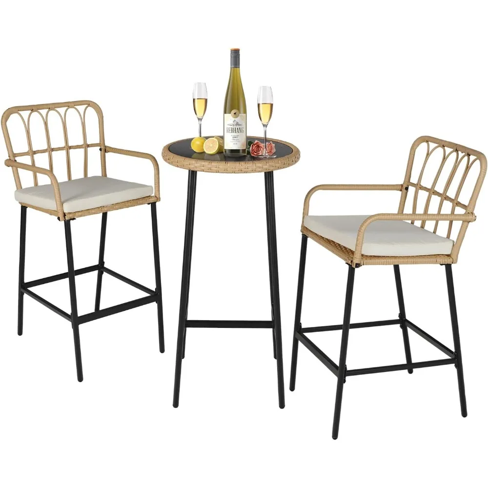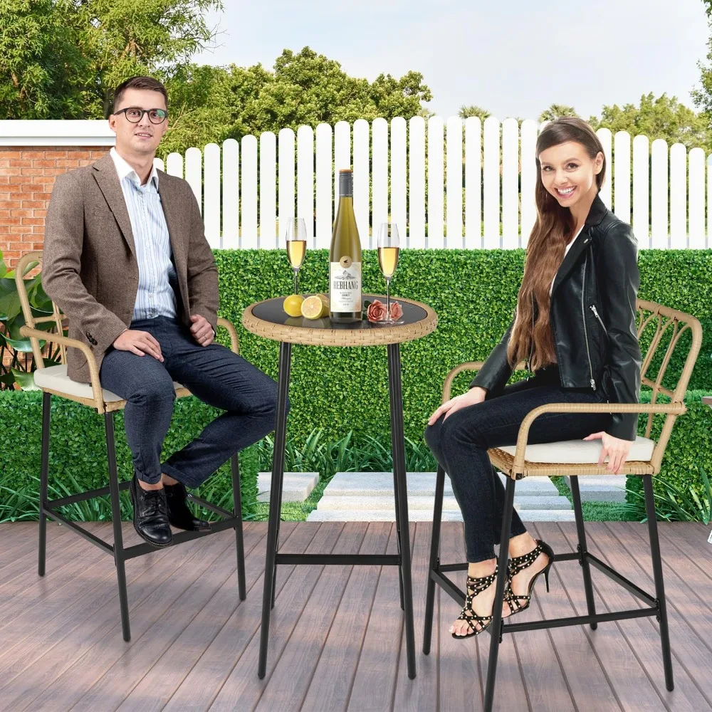 DUE 3-Piece Patio Rattan Bar Set,Outdoor High Top Table and Chairs Set with Cushions&1 Tempered Glass Bar Table,Patio Bistro Dining