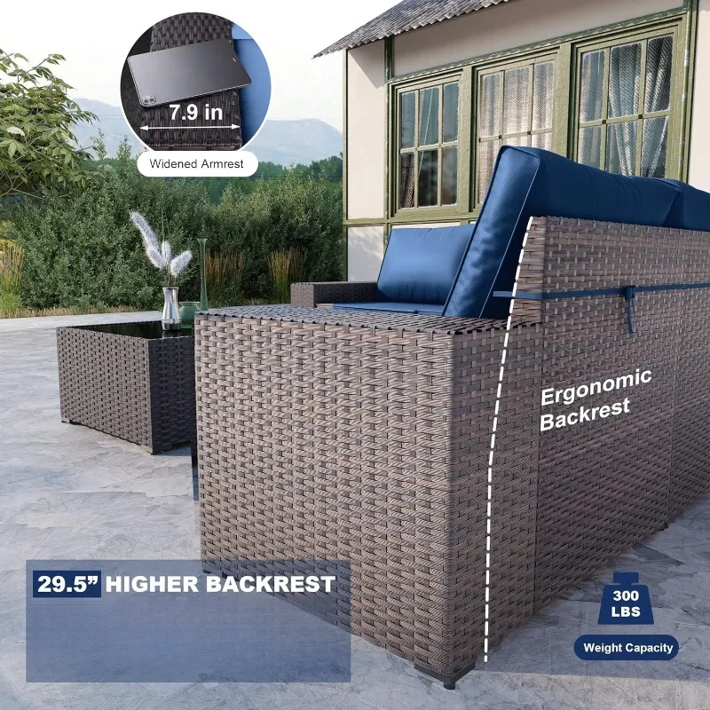 Upgraded Design:The patio sectional sofa set is totally upgraded,the widened armrest gives you more space to hold your arm, improving your user experience. You also can put books or drinks on the armrest when you enjoy the outdoor life. Meanwhile, the heightened back support is more ergonomic which can enlarge the surface between you and the back support, giving you the most comfortable user experience.