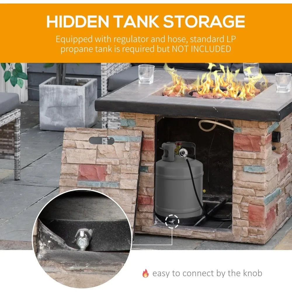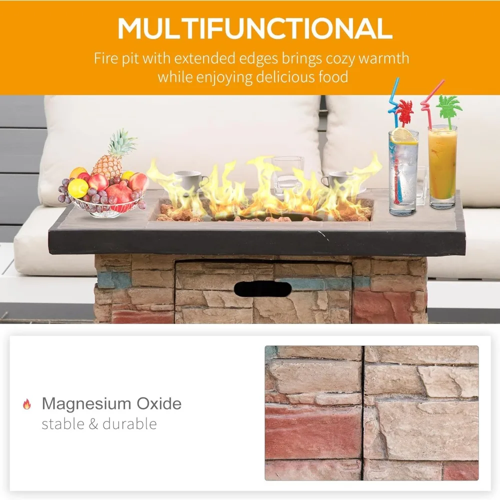 - Stone Like Look: Our propane fire pit table is made of magnesium oxide, designed with a stacked stone pillar appearance. It can easily add a rustic touch to your outdoor space. The spacious edge of our patio fire pit is excellent for holding drinks, or food.