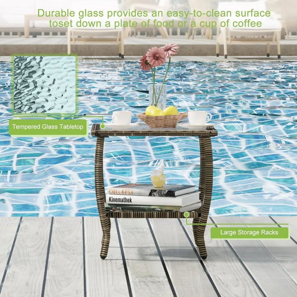 - Coffee Table: Accompanying this patio conversation set is a rattan coffee Table with a large storage shelf. Use it to hold your favorite beverage or display decorative items