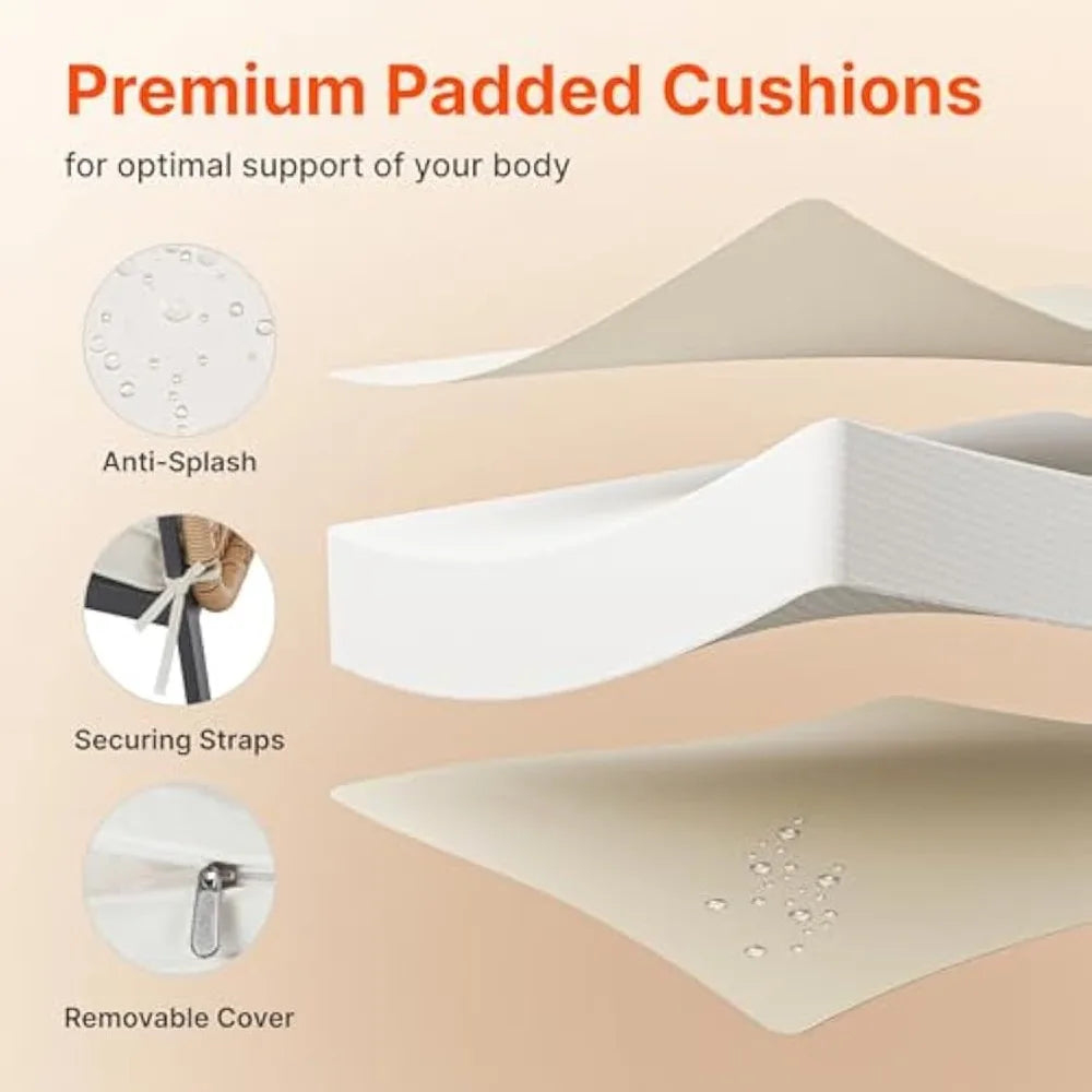 HAND-WOVEN RATTAN OUTDOOR CHAIRS: Our outdoor chairs are crafted with full hand-woven rattan, combining timeless elegance and durability. Our patio dining set is made from FSC-certified wood.The double-layered rattan backrest not only enhances breathability but also adds a touch of sophistication. Built with a sturdy metal frame and paired with thick, soft cushions, these chairs offer exceptional comfort and support, capable of holding up to 330 lbs