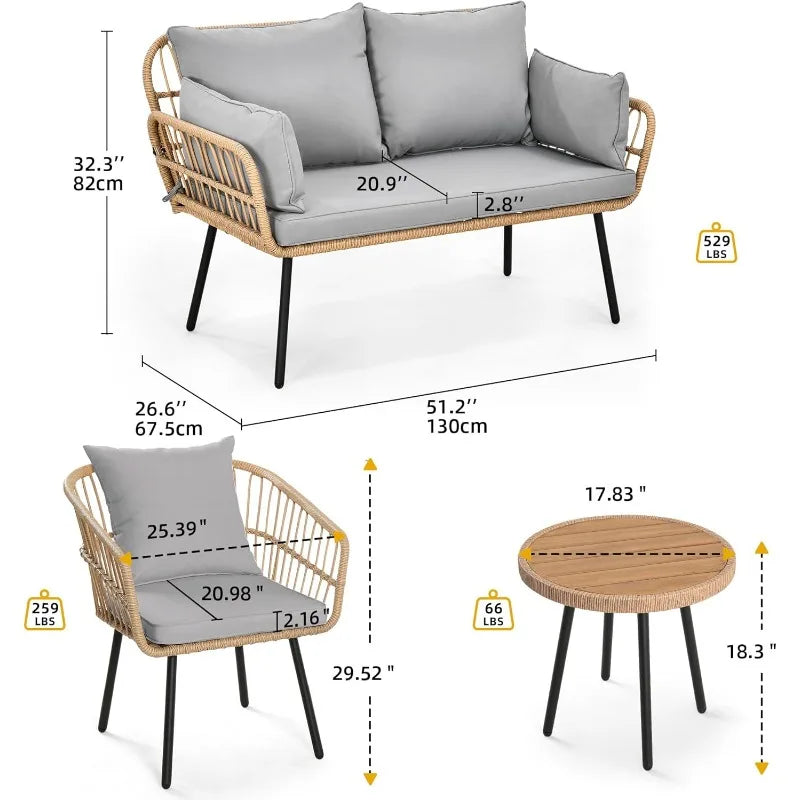 Patio Furniture Set, 4 Pieces Boho Wicker Bistro Set, All Weather Outdoor Rattan Conversation Set with Loveseat Chairs Table Soft Cushions for Backyard, Pool, Garden - Grey