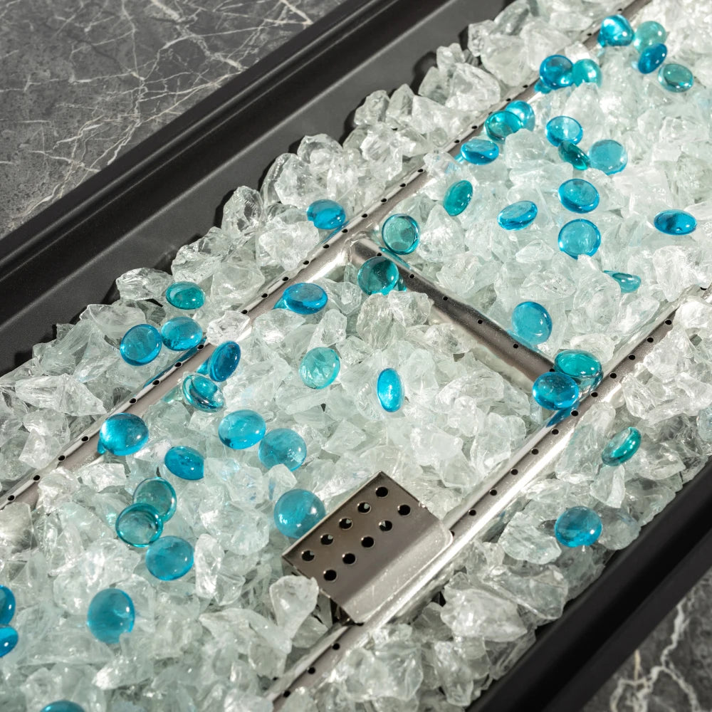 Notice NOT Suitable for Natural Gas! Dark Brown Wicker Body Ceramic Tile Tabletop Steel Frame ETL Approved Stainless Steel Burner With Electronic Pulse Igniter Fuel: Propane / Liquefied Petroleum Gas Area Heated:11 Sq.Ft Bowl Depth: 2.2inch Housing Material: Steel + PE Rattan (or Wicker) Tabletop Material: Ceramic Tile (or Marble Tile) Flame Adjustable: Yes Steel Lid: Included Heat output: 50000BTU Rain Cover: Included Rocks: Included (with mixed color glass rocks) Gas Regulator with Hose: Included Glass Windshield (Guard): Included LNG(Natural gas): No Support