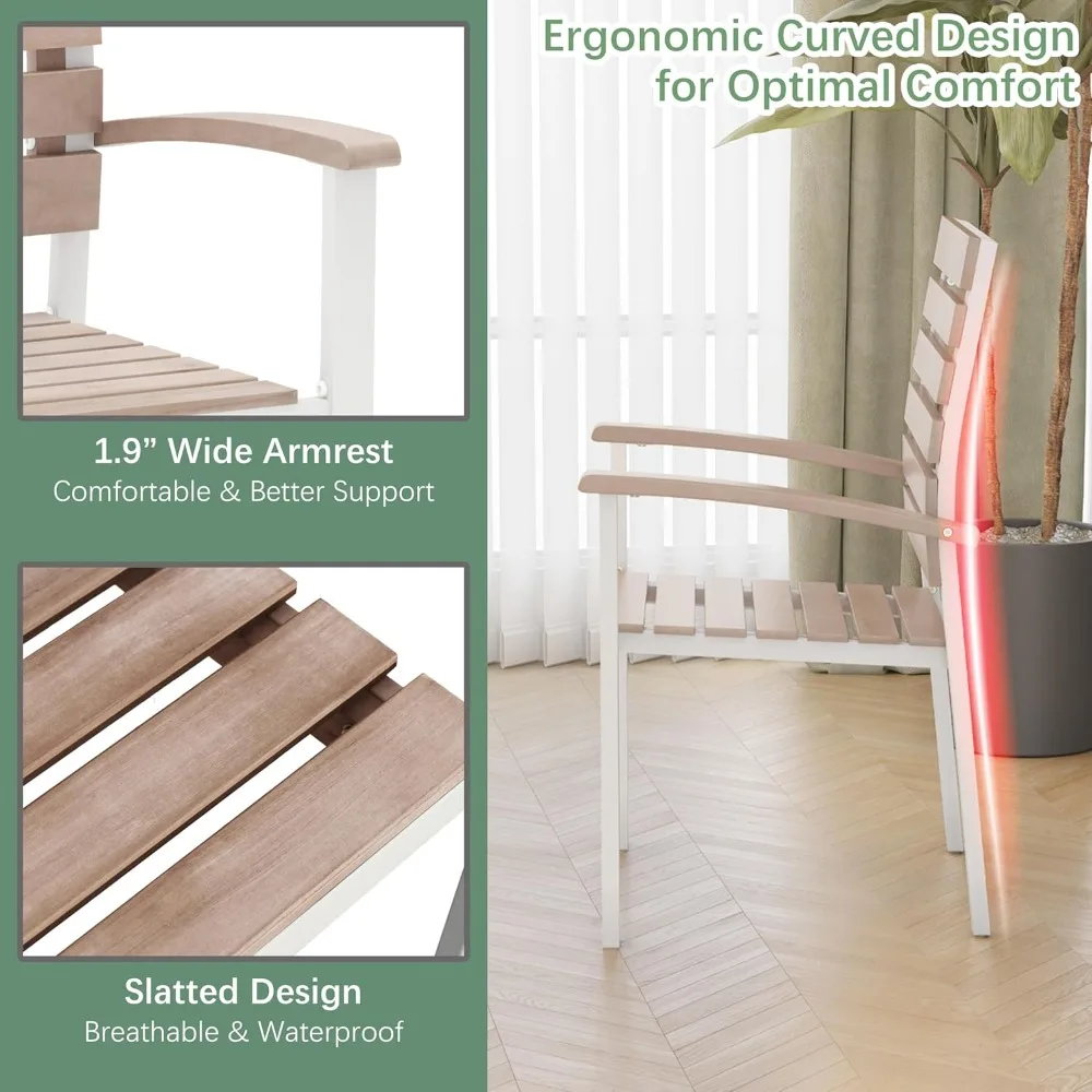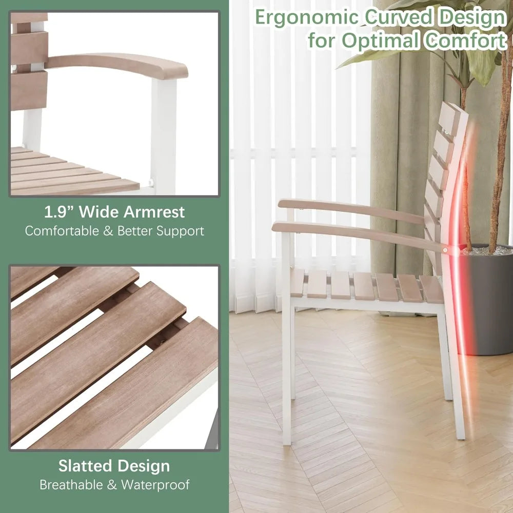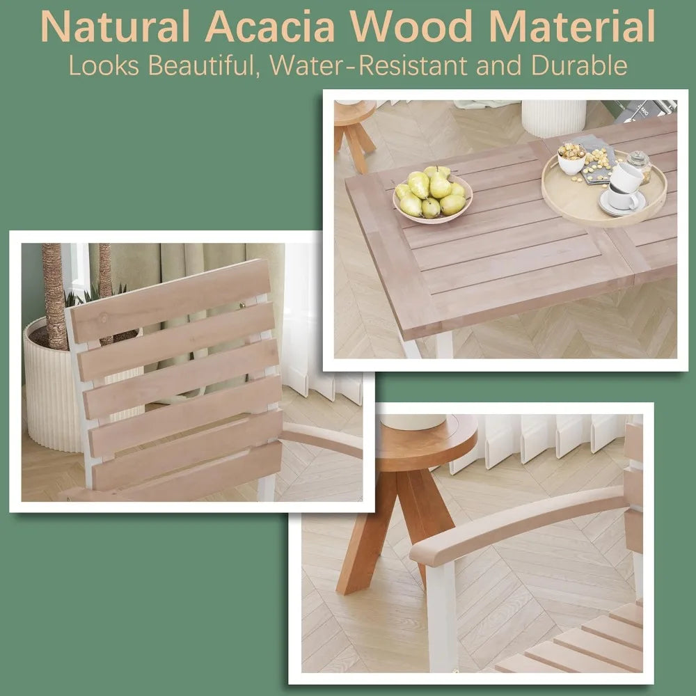 - Premium Solid Acacia Wood---The tabletop, chair seats and backs are made from natural solid acacia wood, showcasing fine craftsmanship with excellent durability and load-bearing strength. The waterproof surface enhances longevity, while the open-slat design prevents water accumulation and speeds up drying after rain, adding both beauty and function.