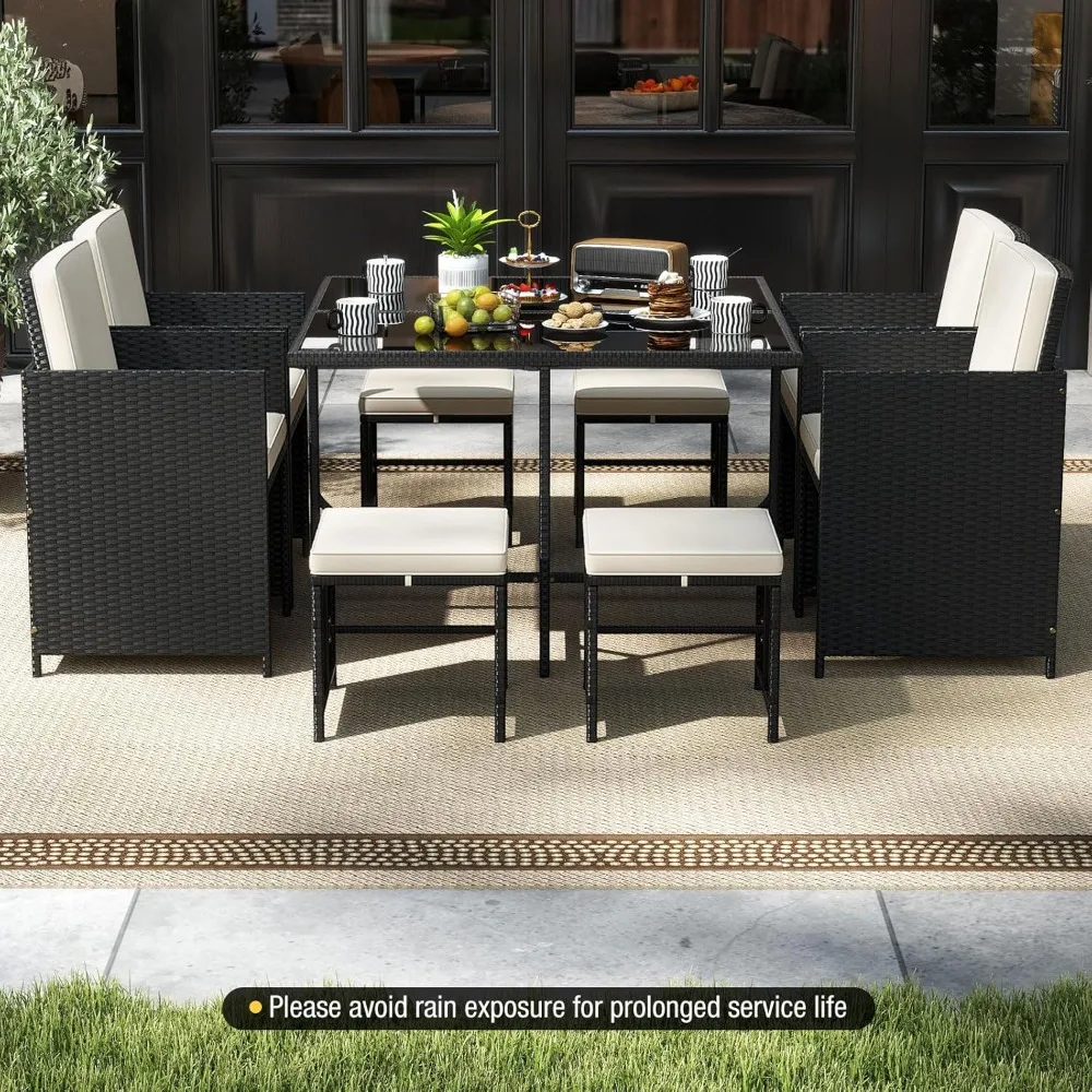 - Space-Saving Storage: Keep your outdoor space tidy and organized with the smart design of the outdoor rattan dining set. The chair backrests can be folded down, and the ottomans can be stored neatly underneath the chairs, saving valuable patio or deck space when not in use. As needed, the chairs can be stored under the table.